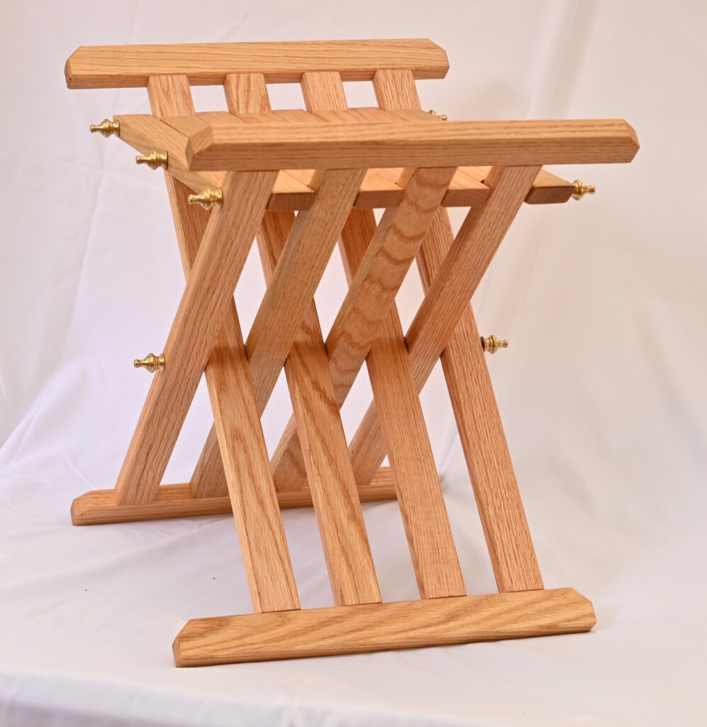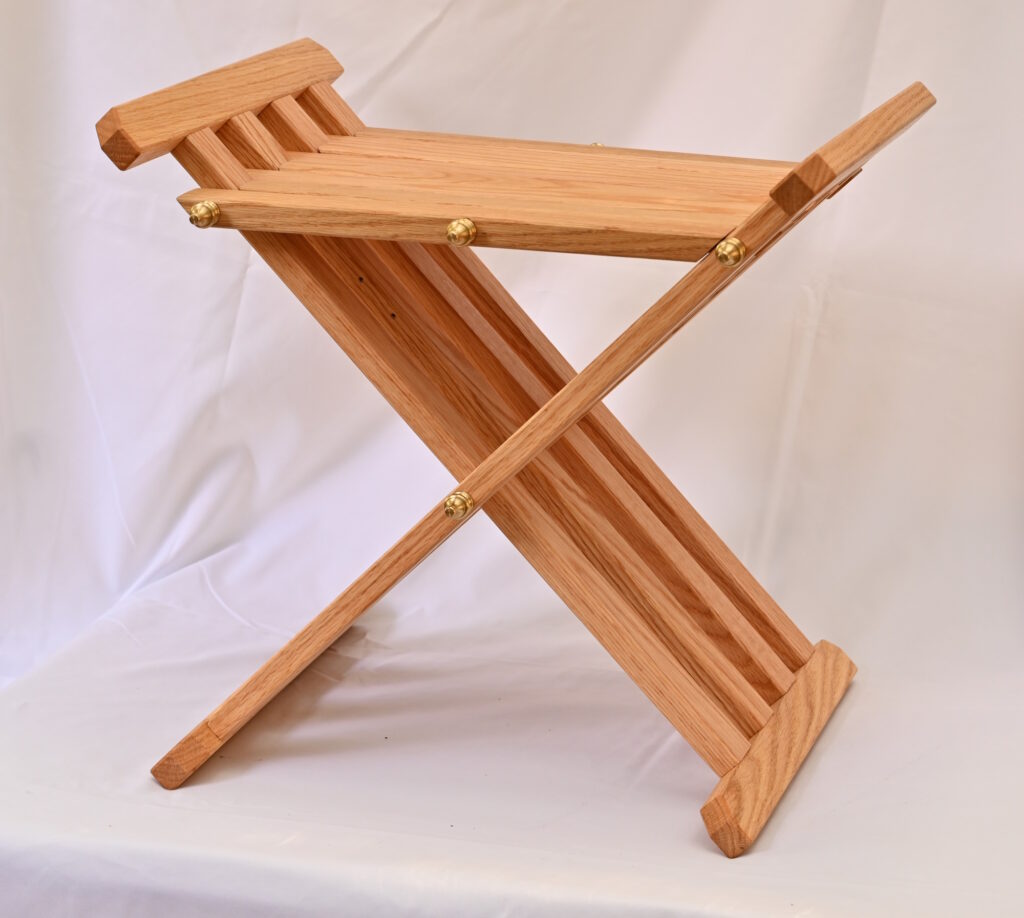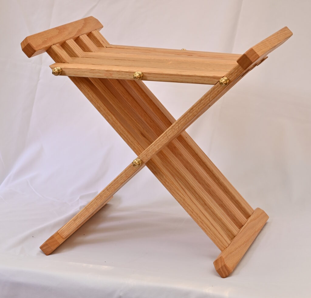 This is a reconstruction of a lightweight, portable seat common in 15th—and 16th-century Europe. It folds nearly flat for easy packing and storage, making it ideal for your reenactment groups in the hall, on the field, or the court.