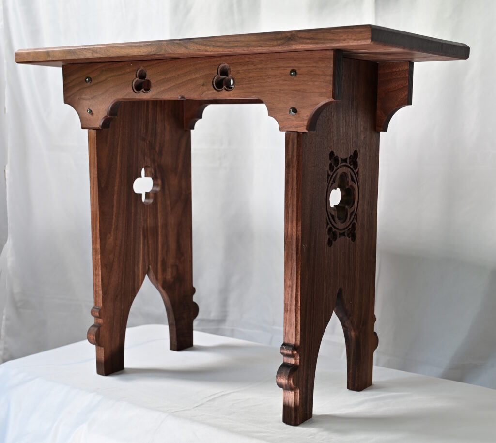 This bench was based on a bench in the image ‘L’annonciation’ in Les heures de Pigouchet pour Vostre (Pigoichet’s Book of Hours for Vostre), which dates to the third quarter of the 15th Century. This image, along with many others and a discussion of the material culture of 15th-century France, can be found in Les Debuts Du Livre Imprime (1983).